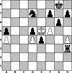 game notation in PGN-format [Event "Entdeckung der Langsamkeit"] [Site "www.myChess.de"] [Date "2009.08.15"] [Round "1"] [White "sel"] [Black "Vahl1"] [ECO "D10"] [WhitemyELO "1411"] [BlackmyELO "1732"] [Result "0-1"] [TimeControl "10/3456000"] [WhiteDays "200"] [BlackDays "199"] [MyChessNo "58379"] 1. d4 d5 2. c4 c6 3. e3 Nf6 4. h3 Bf5 5. Bd3 Bxd3 6. Qxd3 Nbd7 7. c5 e5 8. b4 e4 9. Qd1 b6 10. a4 a5 11. b5 bxc5 12. Ba3 cxb5 13. Ne2 b4 14. Bb2 c4 15. Ng3 c3 16. Bc1 Qc7 17. Qe2 Bd6 18. Nf5 O-O 19. Nxd6 Qxd6 20. f4 Rfc8 21. O-O Rab8 22. g3 c2 23. Nd2 Qc6 24. g4 b3 25. Bb2 g6 26. Ra3 c1=Q 27. Rxc1 Qxc1+ 28. Bxc1 Rxc1+ 29. Kf2 b2 30. Ra2 Ra1 31. Nb1 Rxb1 32. g5 Rh1 33. Rxb2 Rxb2 34. Qxb2 Rh2+ 35. Kg3 Rxb2 36. gxf6 Nxf6 37. h4 Rb3 38. f5 Rxe3+ 39. Kf4 Rh3 40. Ke5 Nd7+ 0-1 position notation in FEN-format 6k1/3n1p1p/6p1/p2pKP2/P2Pp2P/7r/8/8 - - - 4 41 Captured white pieces: Captured black pieces: Click on a captured piece in order to display the desired move!