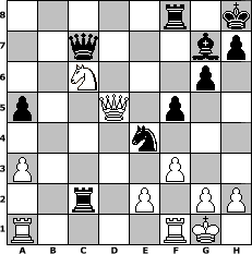 game notation in PGN-format [Event "my schach.de darf nicht einschlafen!!"] [Site "www.myChess.de"] [Date "2018.08.17"] [Round "2"] [White "Steffi"] [Black "Seneca"] [ECO "B07"] [WhitemyELO "1549"] [BlackmyELO "1469"] [Result "0-1"] [TimeControl "10/1728000"] [WhiteDays "13"] [BlackDays "20"] [MyChessNo "112937"] 1. e4 d6 2. d4 Nf6 3. Nc3 c6 4. Bg5 g6 5. Nf3 Bg7 6. Bd3 O-O 7. O-O b5 8. a3 a5 9. e5 dxe5 10. dxe5 Ne8 11. Be4 Qc7 12. Nxb5 Qb7 13. Nbd4 f6 14. exf6 exf6 15. Be3 Nd6 16. Bf4 Nxe4 17. Qd3 f5 18. Qc4+ Kh8 19. Bxb8 Rxb8 20. Nxc6 Qc7 21. Qd5 Rxb2 22. Nfd4 Bb7 23. f3 Bxc6 24. Nxc6 Rxc2 0-1 position notation in FEN-format 5r1k/2q3bp/2N3p1/p2Q1p2/4n3/P4P2/2r1P1PP/R4RK1 - - - 0 25 Captured white pieces: Captured black pieces: Click on a captured piece in order to display the desired move!