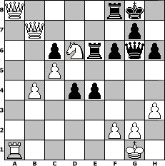 game notation in PGN-format [Event "unter uns Nr. 49 (Covid 19)"] [Site "www.myChess.de"] [Date "2021.02.05"] [Round "1"] [White "boeserWatz"] [Black "gunni50"] [ECO "C44"] [WhitemyELO "1280"] [BlackmyELO "1277"] [Result "1-0"] [TimeControl "10/864000"] [WhiteDays "48"] [BlackDays "33"] [MyChessNo "121017"] 1. e4 e5 2. Nf3 Nc6 3. b3 Nf6 4. d3 Bc5 5. h3 O-O 6. Be2 b6 7. O-O d5 8. Bg5 Be7 9. Bxf6 Bxf6 10. Nc3 d4 11. Nd5 Be6 12. Nxf6+ Qxf6 13. Qd2 a5 14. c3 a4 15. b4 b5 16. c4 bxc4 17. dxc4 Rab8 18. a3 Rfd8 19. Qd3 Na7 20. c5 Nb5 21. Bd1 Bd7 22. Bxa4 Nc3 23. Bxd7 Rxd7 24. Nd2 c6 25. Nc4 Re8 26. Nb6 Rde7 27. a4 Qg6 28. a5 Nxe4 29. a6 Ra7 30. Qf3 Nd2 31. Qe2 Nxf1 32. Qxf1 e4 33. Nc4 h6 34. Nd6 Re6 35. Nc8 Ra8 36. Nb6 Ra7 37. Nc8 Ra8 38. Nd6 Rd8 39. a7 Ra8 40. Qa6 f6 41. Qb7 Rf8 42. a8=Q 1-0 position notation in FEN-format Q4rk1/1Q4p1/2pNrpqp/2P5/1P1pp3/7P/5PP1/R5K1 - - - 0 42 Captured white pieces: Captured black pieces: Click on a captured piece in order to display the desired move!