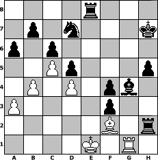 game notation in PGN-format [Event "Einer wird gewinnen !!!"] [Site "www.myChess.de"] [Date "2017.09.28"] [Round "1"] [White "augustus"] [Black "Rabenvogel"] [ECO "D00"] [WhitemyELO "1223"] [BlackmyELO "1507"] [Result "0-1"] [TimeControl "10/1728000"] [WhiteDays "12"] [BlackDays "20"] [MyChessNo "109760"] 1. d4 d5 2. e3 a6 3. c4 e6 4. Nf3 c6 5. Ne5 Nf6 6. a3 Bd6 7. Nf3 h6 8. c5 Bc7 9. Bd3 Ba5+ 10. b4 Bc7 11. O-O O-O 12. Nh4 e5 13. Bb2 e4 14. Bc2 Bxh2+ 15. Kxh2 Ng4+ 16. Kg3 Qc7+ 17. f4 Nxe3 18. Qe2 Nxf1+ 19. Qxf1 g5 20. Kf2 Qxf4+ 21. Kg1 Qxh4 22. Bc3 f5 23. g3 Qxg3+ 24. Qg2 Qe3+ 25. Qf2 Qc1+ 26. Kg2 Qf4 27. Qxf4 gxf4 28. Bd1 f3+ 29. Kf2 f4 30. Bxf3 exf3 31. Nd2 Bg4 32. Rg1 h5 33. Nf1 Re8 34. Nh2 Re2+ 35. Kf1 Rxh2 36. Be1 Kh7 37. Bf2 Nd7 38. Ke1 Re8+ 0-1 position notation in FEN-format 4r3/1p1n3k/p1p5/2Pp3p/1P1P1pb1/P4p2/5B1r/4K1R1 - - - 6 39 Captured white pieces: Captured black pieces: Click on a captured piece in order to display the desired move!