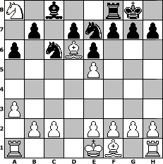 game notation in PGN-format [Event "Wrixum - Open die IX"] [Site "www.myChess.de"] [Date "2011.10.15"] [Round "1"] [White "pepo47"] [Black "73DADDELDU37"] [ECO "B32"] [WhitemyELO "1983"] [BlackmyELO "1431"] [Result "1-0"] [TimeControl "10/2592000"] [WhiteDays "59"] [BlackDays "55"] [MyChessNo "76879"] 1. e4 c5 2. Nf3 Nc6 3. d4 cxd4 4. Nxd4 e6 5. Nc3 Bb4 6. Ndb5 Nf6 7. a3 Be7 8. Nd6+ Bxd6 9. Qxd6 Qe7 10. Bf4 Qxd6 11. Bxd6 a6 12. e5 Ng8 13. Na4 Nge7 14. Nb6 O-O 15. Nxa8 1-0 position notation in FEN-format N1b2rk1/1p1pnppp/p1nBp3/4P3/8/P7/1PP1PPPP/R3KB1R - KQ - 0 15 Captured white pieces: ![]() ![]() ![]() ![]() ![]() ![]() ![]() ![]() ![]() ![]() ![]() ![]() ![]() ![]() ![]() Captured black pieces: ![]() ![]() ![]() ![]() ![]() ![]() ![]() ![]() ![]() ![]() ![]() ![]() ![]() ![]() ![]() Click on a captured piece in order to display the desired move!