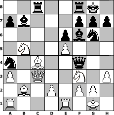 game notation in PGN-format [Event "Sommerpause"] [Site "www.myChess.de"] [Date "2011.06.29"] [Round "2"] [White "Steffi"] [Black "Naunhofer"] [ECO "D31"] [WhitemyELO "1525"] [BlackmyELO "1611"] [Result "0-1"] [TimeControl "10/864000"] [WhiteDays "02"] [BlackDays "10"] [MyChessNo "74772"] 1. d4 d5 2. c4 e6 3. Nc3 Ne7 4. Nf3 dxc4 5. e4 Ng6 6. Bxc4 Be7 7. O-O O-O 8. a3 b6 9. Re1 Bb7 10. h3 Nd7 11. b4 c5 12. bxc5 bxc5 13. dxc5 Nxc5 14. Qc2 Rc8 15. Bb2 Qc7 16. Nb5 Qf4 17. Qc3 Bf6 18. e5 Na4 0-1 position notation in FEN-format 2r2rk1/pb3ppp/4pbn1/1N2P3/n1B2q2/P1Q2N1P/1B1P1PP1/R3R1K1 - - - 1 19 Captured white pieces: Captured black pieces: Click on a captured piece in order to display the desired move!