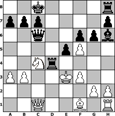 game notation in PGN-format [Event "Albspiele 4"] [Site "www.myChess.de"] [Date "2010.05.30"] [Round "1"] [White "Caligula"] [Black "Winston"] [ECO "D02"] [WhitemyELO "1342"] [BlackmyELO "1467"] [Result "0-1"] [TimeControl "10/2592000"] [WhiteDays "30"] [BlackDays "30"] [MyChessNo "65872"] 1. d4 d5 2. Nf3 Nc6 3. e3 Nf6 4. c4 Bf5 5. cxd5 Nxd5 6. Nc3 Ncb4 7. a3 Nc2+ 8. Ke2 Nxa1 9. Nxd5 Qxd5 10. Qd2 Nb3 11. Qc3 Nxc1+ 12. Qxc1 Qb3 13. Nd2 Qb6 14. Nc4 Qc6 15. Kd2 O-O-O 16. b3 f6 17. f3 e5 18. e4 Rxd4+ 19. Ke3 g6 20. exf5 Bh6+ 0-1 position notation in FEN-format 2k4r/ppp4p/2q2ppb/4pP2/2Nr4/PP2KP2/6PP/2Q2B1R - - - 1 21 Captured white pieces: Captured black pieces: Click on a captured piece in order to display the desired move!