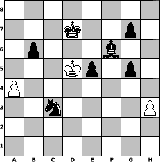 game notation in PGN-format [Event "1.Manschaftstunier der MIB-Jetzt Wirts Brutal"] [Site "www.myChess.de"] [Date "2006.05.19"] [Round "2"] [White "alpacino"] [Black "Whiskey40"] [ECO "A06"] [WhitemyELO "1332"] [BlackmyELO "1318"] [Result "0-1"] [TimeControl "10/2592000"] [WhiteDays "147"] [BlackDays "141"] [MyChessNo "25536"] 1. Nf3 d5 2. c3 Bf5 3. d3 Nc6 4. Nbd2 e5 5. e4 dxe4 6. dxe4 Bg6 7. Bd3 Qxd3 8. Ng5 O-O-O 9. Qg4+ Kb8 10. Qf3 Qxf3 11. Ngxf3 f5 12. O-O fxe4 13. Nh4 Bc5 14. Nxg6 hxg6 15. Nxe4 Be7 16. Be3 Nf6 17. Ng5 Nd5 18. Nf7 Nxe3 19. fxe3 Rhf8 20. Nxd8 Rxf1+ 21. Rxf1 Bxd8 22. Rf7 Bf6 23. Rf8+ Nd8 24. Kf2 b6 25. a3 Kb7 26. e4 g5 27. Kf3 Ne6 28. Re8 Nc5 29. Ke3 a5 30. h3 Na4 31. b3 Nxc3 32. Kd3 Nb5 33. a4 Nd4 34. Kc4 Ne2 35. Re6 Nd4 36. Re8 Kc6 37. g3 Ne2 38. Re6+ Kd7 39. Rxb6 cxb6 40. b4 axb4 41. Kxb4 Nxg3 42. Kc4 Nxe4 43. Kd5 Nc3+ 0-1 position notation in FEN-format 8/3k2p1/1p3b2/3Kp1p1/P7/2n4P/8/8 - - - 2 44 Captured white pieces: ![]() ![]() ![]() ![]() ![]() ![]() ![]() ![]() ![]() ![]() ![]() ![]() ![]() ![]() ![]() Captured black pieces: ![]() ![]() ![]() ![]() ![]() ![]() ![]() ![]() ![]() ![]() ![]() ![]() ![]() ![]() ![]() Click on a captured piece in order to display the desired move!