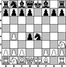 game notation in PGN-format [Event "Gl"] [Site "www.myChess.de"] [Date "2012.06.07"] [Round "1"] [White "micha62"] [Black "lotchi"] [ECO "A00"] [WhitemyELO "1004"] [BlackmyELO "1187"] [Result "0-1"] [TimeControl "10/2592000"] [WhiteDays "00"] [BlackDays "30"] [MyChessNo "82052"] 1. b4 e5 2. e4 Nf6 3. d4 Nxe4 4. Nh3 exd4 0-1 position notation in FEN-format rnbqkb1r/pppp1ppp/8/8/1P1pn3/7N/PPP2PPP/RNBQKB1R - KQkq - 0 5 Captured white pieces: ![]() ![]() ![]() ![]() ![]() ![]() ![]() ![]() ![]() ![]() ![]() ![]() ![]() ![]() ![]() Captured black pieces: ![]() ![]() ![]() ![]() ![]() ![]() ![]() ![]() ![]() ![]() ![]() ![]() ![]() ![]() ![]() Click on a captured piece in order to display the desired move!