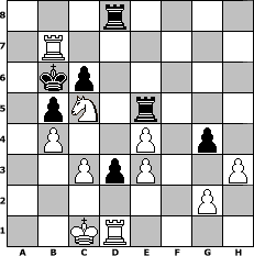 game notation in PGN-format [Event "Turnier f"] [Site "www.myChess.de"] [Date "2008.08.21"] [Round "2"] [White "Schmalte"] [Black "Knight"] [ECO "C68"] [WhitemyELO "1473"] [BlackmyELO "1208"] [Result "1-0"] [TimeControl "10/2592000"] [WhiteDays "117"] [BlackDays "117"] [MyChessNo "47318"] 1. e4 e5 2. Nf3 Nc6 3. Bb5 a6 4. Bxc6 dxc6 5. Nxe5 Qd4 6. Nf3 Qb6 7. Qe2 Bg4 8. d3 O-O-O 9. h3 Bxf3 10. Qxf3 Nf6 11. b3 Bc5 12. Be3 Bxe3 13. Qxe3 Qxe3+ 14. fxe3 Rhe8 15. Nd2 b5 16. b4 Kb7 17. Rf1 h5 18. O-O-O Kb6 19. Rf5 a5 20. a3 axb4 21. axb4 h4 22. Nb3 Re7 23. Na5 Ng8 24. Rh5 Nf6 25. Rxh4 c5 26. c3 Re5 27. Nb3 c4 28. Nc5 g5 29. Rh6 g4 30. Rxf6+ c6 31. Rxf7 cxd3 32. Rb7# 1-0 position notation in FEN-format 3r4/1R6/1kp5/1pN1r3/1P2P1p1/2PpP2P/6P1/2KR4 - - - 1 32 Captured white pieces: ![]() ![]() ![]() ![]() ![]() ![]() ![]() ![]() ![]() ![]() ![]() ![]() ![]() ![]() ![]() Captured black pieces: ![]() ![]() ![]() ![]() ![]() ![]() ![]() ![]() ![]() ![]() ![]() ![]() ![]() ![]() ![]() Click on a captured piece in order to display the desired move!