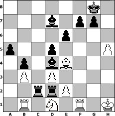 game notation in PGN-format [Event "1.Brefelder Open"] [Site "www.myChess.de"] [Date "2014.10.20"] [Round "1"] [White "Knight"] [Black "FrankB"] [ECO "B20"] [WhitemyELO "1344"] [BlackmyELO "1731"] [Result "0-1"] [TimeControl "10/2592000"] [WhiteDays "119"] [BlackDays "091"] [MyChessNo "96417"] 1. e4 c5 2. g3 e6 3. Bg2 Nc6 4. Nc3 d6 5. Nf3 Nf6 6. d3 Be7 7. O-O O-O 8. Bg5 h6 9. Bxf6 Bxf6 10. Re1 a6 11. a3 Rb8 12. e5 Nxe5 13. Nxe5 Bxe5 14. f4 Bd4+ 15. Kh1 b5 16. Qd2 b4 17. axb4 cxb4 18. Nd1 Qf6 19. Rb1 a5 20. b3 Bd7 21. h3 Rbc8 22. g4 Rc7 23. Rf1 Rfc8 24. Be4 Rxc2 25. Qe1 d5 26. g5 hxg5 27. fxg5 Qxg5 28. h4 Qd2 29. Qxd2 Rxd2 30. h5 Rcc2 0-1 position notation in FEN-format 6k1/3b1pp1/4p3/p2p3P/1p1bB3/1P1P4/2rrP3/1R1N1R1K - - - 1 31 Captured white pieces: ![]() ![]() ![]() ![]() ![]() ![]() ![]() ![]() ![]() ![]() ![]() ![]() ![]() ![]() ![]() Captured black pieces: ![]() ![]() ![]() ![]() ![]() ![]() ![]() ![]() ![]() ![]() ![]() ![]() ![]() ![]() ![]() Click on a captured piece in order to display the desired move!