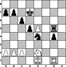 game notation in PGN-format [Event "Aljechin zu Mittag"] [Site "www.myChess.de"] [Date "2006.04.18"] [Round "1"] [White "kalle"] [Black "torsten64"] [ECO "A83"] [WhitemyELO "1641"] [BlackmyELO "1994"] [Result "0-1"] [TimeControl "10/1728000"] [WhiteDays "18"] [BlackDays "20"] [MyChessNo "24676"] 1. d4 f5 2. e4 fxe4 3. Nc3 Nf6 4. Bg5 g6 5. h4 d5 6. h5 Bg4 7. Be2 gxh5 8. Bxf6 exf6 9. Bxg4 hxg4 10. Qxg4 c6 11. Qh5+ Kd7 12. Qf5+ Kc7 13. f3 exf3 14. Nxf3 Qe7+ 15. Kd2 Qg7 16. g4 Nd7 17. Rae1 Bd6 18. Re6 Qg6 19. Ne2 Rag8 20. Rh4 Rg7 21. Qxg6 Rxg6 22. g5 Rhg8 23. Rxh7 fxg5 24. Rxg6 Rxg6 25. Rh5 Nf6 26. Rh1 Ne4+ 27. Ke1 g4 28. Ne5 Bxe5 29. dxe5 Rg5 30. Rg1 Kd7 0-1 position notation in FEN-format 8/pp1k4/2p5/3pP1r1/4n1p1/8/PPP1N3/4K1R1 - - - 3 31 Captured white pieces: Captured black pieces: Click on a captured piece in order to display the desired move!