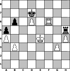 game notation in PGN-format [Event "Andys MySchach-960-Abschiedsturnier 2017"] [Site "www.myChess.de"] [Date "2017.02.18"] [Round "1"] [White "nyffhans"] [Black "Peterlie77 (C)"] [Variant "Fischerrandom"] [SetUp "1"] [FEN "nnbrqkrb/pppppppp/8/8/8/8/PPPPPPPP/NNBRQKRB w KQkq - 0 1"] [WhitemyELO "1993"] [BlackmyELO "2148"] [Result "1-0"] [TimeControl "10/2592000"] [WhiteDays "30"] [BlackDays "00"] [MyChessNo "106984"] 1. c4 g5 2. O-O c5 3. Nb3 Nb6 4. Nxc5 Nxc4 5. d4 d5 6. e3 b6 7. Nd3 Nd7 8. Nc3 Nf6 9. f3 h5 10. g3 Bh3 11. Bg2 Bxg2 12. Kxg2 g4 13. fxg4 Rxg4 14. b3 Nd6 15. Ne5 Rg8 16. e4 dxe4 17. Bh6+ Bg7 18. Qd2 Rh8 19. Bxg7+ Kxg7 20. Qg5+ Kh7 21. Rde1 Rg8 22. Qh4 Kh6 23. Nxe4 Ndxe4 24. Rxe4 Rd6 25. Ref4 Kg7 26. Rc1 Qd8 27. Kg1 Kf8 28. Qh3 Kg7 29. Rf5 Kf8 30. Rff1 Re6 31. Rf4 Kg7 32. Qf5 Rd6 33. Qc2 Rd5 34. Qf2 Kf8 35. Rc2 Rg5 36. h3 Rd6 37. Kh2 Rg7 38. Rh4 Kg8 39. a4 a5 40. Rc4 Qb8 41. Qf5 Qe8 42. Rc8 Rd8 43. Rc6 Rd6 44. Rxd6 exd6 45. Qxf6 dxe5 46. d5 Rg6 47. Qf5 Qd8 48. Qxh5 Qf6 49. Kg2 Kf8 50. Re4 Rg5 51. Qh4 Ke7 52. Re2 Qf5 53. Qc4 Qd7 54. h4 Rh5 55. Qe4 Kf8 56. Rf2 Kg7 57. Rd2 f6 58. Rc2 Qf5 59. Qxf5 Rxf5 60. d6 Kf7 61. Rd2 Ke8 62. Rf2 Rh5 63. Rxf6 Kd7 64. Kf3 Rh8 65. Ke4 Rh5 66. Kd5 e4+ 67. Kxe4 1-0 position notation in FEN-format 8/3k4/1p1P1R2/p6r/P3K2P/1P4P1/8/8 - - - 0 67 Captured white pieces: Captured black pieces: Click on a captured piece in order to display the desired move!