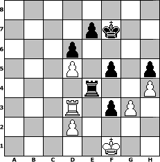 game notation in PGN-format [Event "Auf gute Partien."] [Site "www.myChess.de"] [Date "2010.09.20"] [Round "1"] [White "deepsabel"] [Black "bjeu"] [ECO "A50"] [WhitemyELO "2002"] [BlackmyELO "2009"] [Result "0-1"] [TimeControl "10/1728000"] [WhiteDays "95"] [BlackDays "25"] [MyChessNo "68495"] 1. d4 Nf6 2. c4 a6 3. Nc3 c5 4. d5 b5 5. cxb5 axb5 6. e4 b4 7. Nb5 d6 8. Bf4 Nxe4 9. Nf3 f5 10. Bc4 Nd7 11. O-O g6 12. a3 Bg7 13. axb4 Rxa1 14. Qxa1 Nb6 15. Qa2 Nxc4 16. Qxc4 O-O 17. Nc3 Qb6 18. bxc5 Qxc5 19. Qxc5 Nxc5 20. Be3 Bb7 21. Bd4 Rc8 22. Re1 Bf8 23. g3 Nd3 24. Rd1 Nb4 25. Be3 Bg7 26. Nd4 Kf7 27. Ndb5 Ba6 28. Bd4 Bxb5 29. Nxb5 Bxd4 30. Rxd4 Rc1+ 31. Kg2 Nc2 32. Ra4 Rb1 33. Na3 Rxb2 34. Nxc2 Rxc2 35. Rd4 g5 36. h4 g4 37. Rd1 h5 38. Rd3 Re2 39. Kf1 Re4 40. f4 gxf3 0-1 position notation in FEN-format 8/4pk2/3p4/3P1p1p/4r2P/3R1pP1/3P4/5K2 - - - 0 41 Captured white pieces: Captured black pieces: Click on a captured piece in order to display the desired move!