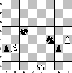 game notation in PGN-format [Event "5erd2"] [Site "www.myChess.de"] [Date "2017.01.17"] [Round "1"] [White "espero"] [Black "atlantis"] [ECO "A45"] [WhitemyELO "1854"] [BlackmyELO "1815"] [Result "0-1"] [TimeControl "10/2592000"] [WhiteDays "106"] [BlackDays "102"] [MyChessNo "106510"] 1. d4 Nf6 2. Bg5 e6 3. Nd2 Be7 4. e4 h6 5. Bh4 d6 6. Bd3 Nc6 7. c3 O-O 8. Ngf3 e5 9. h3 exd4 10. cxd4 Nxe4 11. Bxe7 Qxe7 12. O-O d5 13. Rc1 Bf5 14. Bb5 Nd8 15. Re1 Ne6 16. Bf1 c6 17. Nxe4 dxe4 18. Nd2 Rad8 19. Nxe4 Rxd4 20. Qf3 Bxe4 21. Rxe4 Rfd8 22. Rxd4 Rxd4 23. Bc4 Nf4 24. Bf1 Qb4 25. b3 Qd2 26. Rc4 g6 27. Rxd4 Qxd4 28. g3 Nd5 29. Kg2 f5 30. h4 Qe4 31. Bd3 Qxf3+ 32. Kxf3 h5 33. Bc4 Kf7 34. a4 Ke6 35. Ke2 b5 36. axb5 cxb5 37. Bd3 Kd6 38. f3 Kc5 39. Kd2 a5 40. g4 hxg4 41. fxg4 fxg4 42. Bxg6 g3 43. Ke1 a4 44. bxa4 bxa4 45. Bc2 a3 46. Bb3 Nf4 0-1 position notation in FEN-format 8/8/8/2k5/5n1P/pB4p1/8/4K3 - - - 2 47 Captured white pieces: Captured black pieces: Click on a captured piece in order to display the desired move!