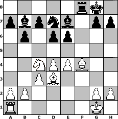 game notation in PGN-format [Event "4. Norderstedter DENK MAL Open 2013"] [Site "www.myChess.de"] [Date "2013.01.09"] [Round "1"] [White "Tomino"] [Black "Tigerle"] [ECO "A46"] [WhitemyELO "1736"] [BlackmyELO "1626"] [Result "1/2-1/2"] [TimeControl "10/2592000"] [WhiteDays "01"] [BlackDays "27"] [MyChessNo "86020"] 1. d4 Nf6 2. Nf3 e6 3. Bf4 b6 4. e3 Bb7 5. Bd3 Ne4 6. Nbd2 f5 7. Ne5 Qf6 8. f3 Nxd2 9. Qxd2 d6 10. Nc4 Nd7 11. O-O Be7 12. c3 O-O 13. e4 fxe4 14. fxe4 Qh4 15. Bg3 Qg4 16. Rf4 Rxf4 17. Qxf4 Qxf4 18. Bxf4 Rf8 1/2-1/2 position notation in FEN-format 5rk1/pbpnb1pp/1p1pp3/8/2NPPB2/2PB4/PP4PP/R5K1 - - - 1 19 Captured white pieces: Captured black pieces: Click on a captured piece in order to display the desired move!