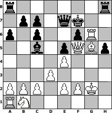 game notation in PGN-format [Event "Svetlana Open 2012"] [Site "www.myChess.de"] [Date "2012.03.22"] [Round "1"] [White "Svetlana"] [Black "alibengali"] [ECO "C68"] [WhitemyELO "1761"] [BlackmyELO "1619"] [Result "1-0"] [TimeControl "10/2592000"] [WhiteDays "26"] [BlackDays "02"] [MyChessNo "80756"] 1. e4 e5 2. Nf3 Nc6 3. Bb5 a6 4. Bxc6 dxc6 5. O-O Bg4 6. h3 Bh5 7. d3 Nf6 8. g4 Bxg4 9. hxg4 Nxg4 10. Nh2 Nxh2 11. Kxh2 Qh4+ 12. Kg2 Bd6 13. Rh1 Qe7 14. Qg4 g6 15. Rh6 Bc5 16. Qh3 f6 17. Rxg6 h5 18. Qf5 Kf7 19. Bg5 1-0 position notation in FEN-format r6r/1pp1qk2/p1p2pR1/2b1pQBp/4P3/3P4/PPP1PPK1/RN6 - - - 3 19 Captured white pieces: Captured black pieces: Click on a captured piece in order to display the desired move!