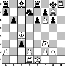 game notation in PGN-format [Event "Dabei ist alles 6"] [Site "www.myChess.de"] [Date "2009.03.21"] [Round "1"] [White "brucybabe"] [Black "gunni50"] [ECO "D24"] [WhitemyELO "1620"] [BlackmyELO "1308"] [Result "1-0"] [TimeControl "10/864000"] [WhiteDays "10"] [BlackDays "10"] [MyChessNo "54092"] 1. d4 d5 2. c4 dxc4 3. Nf3 Nf6 4. Nc3 e6 5. e4 Bb4 6. Bg5 O-O 7. e5 b6 8. exf6 g6 9. Bxc4 Bxc3+ 10. bxc3 c5 11. h4 cxd4 12. h5 dxc3 13. hxg6 Qxd1+ 14. Rxd1 hxg6 15. Bh6 Re8 16. Bg7 Nd7 17. Rh8# 1-0 position notation in FEN-format r1b1r1kR/p2n1pB1/1p2pPp1/8/2B5/2p2N2/P2P1PP1/3RK3 - - - 5 17 Captured white pieces: Captured black pieces: Click on a captured piece in order to display the desired move!