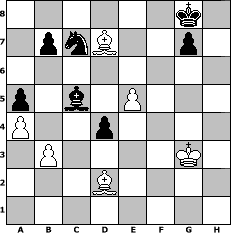 game notation in PGN-format [Event "Auf gute Partien."] [Site "www.myChess.de"] [Date "2010.09.20"] [Round "1"] [White "deepsabel"] [Black "Erich"] [ECO "E46"] [WhitemyELO "2002"] [BlackmyELO "1967"] [Result "1/2-1/2"] [TimeControl "10/1728000"] [WhiteDays "119"] [BlackDays "120"] [MyChessNo "68479"] 1. d4 Nf6 2. c4 e6 3. Nc3 Bb4 4. e3 O-O 5. Nge2 d5 6. a3 Be7 7. cxd5 exd5 8. g3 c6 9. Bg2 Bf5 10. O-O Re8 11. f3 Bf8 12. g4 Be6 13. Nf4 Bc8 14. h3 Nfd7 15. Qc2 Nb6 16. b3 Bd6 17. Nd3 f5 18. gxf5 Bxf5 19. e4 Bg6 20. e5 Be7 21. f4 Qc8 22. Ne2 Na6 23. Ng3 Rf8 24. Be3 Bh4 25. f5 Bxf5 26. Nxf5 Rxf5 27. Bf3 Qe8 28. Nf4 Rf7 29. Bg4 Nc7 30. Ng2 Rxf1+ 31. Rxf1 Be7 32. a4 Nd7 33. Nf4 Nf8 34. Kh2 Kh8 35. Qf2 a5 36. h4 Kg8 37. Bh5 Qd7 38. Bf7+ Kh8 39. Qf3 Qf5 40. h5 Qc2+ 41. Rf2 Qf5 42. Ng6+ hxg6 43. hxg6 Qxf3 44. Rxf3 Nxg6 45. Bxg6 Rf8 46. Rxf8+ Bxf8 47. Bf5 Be7 48. Bf4 c5 49. dxc5 Bxc5 50. Bd7 d4 51. Kg3 Kg8 52. Bd2 1/2-1/2 position notation in FEN-format 6k1/1pnB2p1/8/p1b1P3/P2p4/1P4K1/3B4/8 - - - 3 52 Captured white pieces: Captured black pieces: Click on a captured piece in order to display the desired move!