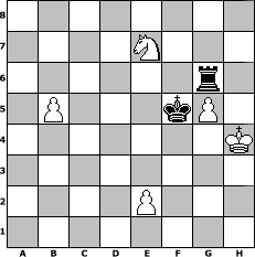 game notation in PGN-format [Event "Advents-Open 2011"] [Site "www.myChess.de"] [Date "2011.11.27"] [Round "1"] [White "Rotstift10"] [Black "Master1"] [ECO "C55"] [WhitemyELO "1564"] [BlackmyELO "1264"] [Result "1-0"] [TimeControl "10/864000"] [WhiteDays "10"] [BlackDays "10"] [MyChessNo "77709"] 1. e4 e5 2. Nf3 Nc6 3. Bc4 Nf6 4. d3 Bc5 5. Bg5 O-O 6. Nbd2 h6 7. Bxf6 Qxf6 8. c3 d6 9. b4 Bb6 10. a4 a6 11. Bd5 Ne7 12. Bb3 Be6 13. c4 a5 14. b5 c6 15. O-O d5 16. cxd5 cxd5 17. exd5 Nxd5 18. Ne4 Qe7 19. Nxe5 Bd4 20. Nc4 Rfd8 21. Rc1 f5 22. Ng3 Nf6 23. Kh1 Rac8 24. Nxa5 Bxb3 25. Nxb3 Rxc1 26. Qxc1 Qb4 27. Qc4+ Qxc4 28. dxc4 b6 29. Nxf5 Bc3 30. Ne7+ Kf7 31. Nc6 Rd6 32. f4 Ne4 33. Ne5+ Ke6 34. Ng4 Kf5 35. Ne3+ Kf6 36. Nd5+ Kf5 37. Nxc3 Nxc3 38. a5 bxa5 39. Nxa5 Na4 40. h3 g6 41. Kh2 Nc5 42. Nc6 h5 43. Kg3 Ne4+ 44. Kh4 Nd2 45. g4+ hxg4 46. hxg4+ Ke4 47. Rf2 Nxc4 48. f5 gxf5 49. Rxf5 Rg6 50. Rc5 Ne3 51. g5 Nf5+ 52. Rxf5 Kxf5 53. Ne7+ 1-0 position notation in FEN-format 8/4N3/6r1/1P3kP1/7K/8/4P3/8 - - - 1 53 Captured white pieces: ![]() ![]() ![]() ![]() ![]() ![]() ![]() ![]() ![]() ![]() ![]() ![]() ![]() ![]() ![]() Captured black pieces: ![]() ![]() ![]() ![]() ![]() ![]() ![]() ![]() ![]() ![]() ![]() ![]() ![]() ![]() ![]() Click on a captured piece in order to display the desired move!