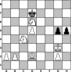 game notation in PGN-format [Event "Froms Gambit abgelehnt"] [Site "www.myChess.de"] [Date "2005.11.15"] [Round "2"] [White "UPS"] [Black "Juri"] [ECO "A02"] [WhitemyELO "1746"] [BlackmyELO "1531"] [Result "1-0"] [TimeControl "10/2592000"] [WhiteDays "30"] [BlackDays "30"] [MyChessNo "19654"] 1. f4 e5 2. d3 Bd6 3. fxe5 Bxe5 4. Nf3 d6 5. e3 c5 6. Be2 Qa5+ 7. c3 Nc6 8. O-O Nf6 9. d4 cxd4 10. exd4 Bxh2+ 11. Nxh2 O-O 12. Nd2 Re8 13. Nc4 Qd5 14. Qd3 Nh5 15. Bf3 Bf5 16. Bxd5 Bxd3 17. Bxf7+ Kh8 18. Nxd6 Nf6 19. Rxf6 Re1+ 20. Rf1 Bxf1 21. Nxf1 Rf8 22. Kf2 Re7 23. Bf4 b5 24. Re1 Rd7 25. Kg3 Rdxf7 26. Nxf7+ Kg8 27. Nd6 a6 28. Nd2 b4 29. N2c4 a5 30. d5 Na7 31. Nb6 h6 32. Re7 Rb8 33. Ndc4 Nc8 34. Re8+ Kf7 35. Rxc8 Rxc8 36. Nxc8 g5 37. Be5 bxc3 38. Bxc3 Ke8 39. Bxa5 Kd7 40. N8d6 h5 41. Bd2 1-0 position notation in FEN-format 8/3k4/3N4/3P2pp/2N5/6K1/PP1B2P1/8 - - - 1 41 Captured white pieces: Captured black pieces: Click on a captured piece in order to display the desired move!