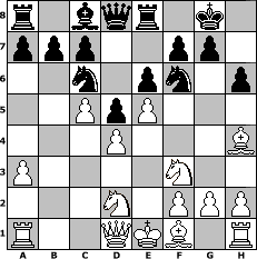 game notation in PGN-format [Event "Rechnerfrei A"] [Site "www.myChess.de"] [Date "2010.02.05"] [Round "1"] [White "beowulf"] [Black "Steppenwolf"] [ECO "D30"] [WhitemyELO "1314"] [BlackmyELO "1245"] [Result "1-0"] [TimeControl "10/1728000"] [WhiteDays "39"] [BlackDays "18"] [MyChessNo "62894"] 1. d4 d5 2. c4 e6 3. Nf3 Nf6 4. Bg5 Bb4+ 5. Nbd2 O-O 6. a3 Ba5 7. b4 Bb6 8. c5 Bxc5 9. bxc5 h6 10. Bh4 Nc6 11. e4 Re8 12. e5 1-0 position notation in FEN-format r1bqr1k1/ppp2pp1/2n1pn1p/2PpP3/3P3B/P4N2/3N1PPP/R2QKB1R - KQ - 0 12 Captured white pieces: Captured black pieces: Click on a captured piece in order to display the desired move!