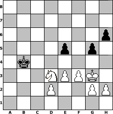 game notation in PGN-format [Event "Sommerevent"] [Site "www.myChess.de"] [Date "2018.07.12"] [Round "1"] [White "Naunhofer"] [Black "Ziegert"] [ECO "D02"] [WhitemyELO "1637"] [BlackmyELO "1622"] [Result "1-0"] [TimeControl "10/1728000"] [WhiteDays "20"] [BlackDays "00"] [MyChessNo "112615"] 1. d4 d5 2. Nf3 Nf6 3. c4 e6 4. Nc3 Nbd7 5. Bg5 h6 6. Bh4 dxc4 7. e3 b6 8. Bxc4 Bb4 9. O-O Bb7 10. a3 Be7 11. Be2 c5 12. dxc5 Nxc5 13. Bb5+ Ncd7 14. Ne5 O-O 15. Nxd7 Nxd7 16. Bxe7 Qxe7 17. Qxd7 Qxd7 18. Bxd7 Rad8 19. Rad1 Ba6 20. Bb5 Bb7 21. Rxd8 Rxd8 22. Rd1 Rxd1+ 23. Nxd1 Kf8 24. f3 Ke7 25. Nc3 a6 26. Bd3 f5 27. Na4 b5 28. Nc5 Bc8 29. b4 Kd6 30. Kf2 g5 31. Kg3 e5 32. a4 bxa4 33. Nxa4 Bd7 34. Nc5 Bb5 35. Bxf5 Kd5 36. Bc8 Kc6 37. Bxa6 Bxa6 38. Nxa6 Kb5 39. Nc5 Kxb4 40. Nd3+ 1-0 position notation in FEN-format 8/8/7p/4p1p1/1k6/3NPPK1/3P2PP/8 - - - 1 40 Captured white pieces: Captured black pieces: Click on a captured piece in order to display the desired move!