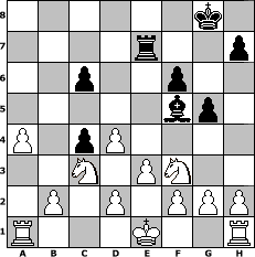 game notation in PGN-format [Event "Schach dem Osterhasen VIII"] [Site "www.myChess.de"] [Date "2020.04.07"] [Round "1"] [White "miu"] [Black "augustus"] [ECO "D30"] [WhitemyELO "1526"] [BlackmyELO "1248"] [Result "1-0"] [TimeControl "10/2592000"] [WhiteDays "30"] [BlackDays "00"] [MyChessNo "117950"] 1. d4 d5 2. c4 e6 3. Nf3 f6 4. cxd5 exd5 5. Nc3 Bb4 6. Qc2 Ne7 7. Bf4 Bf5 8. Qb3 c6 9. Qxb4 Na6 10. Qxb7 g5 11. Bg3 Nb8 12. Qxa8 O-O 13. Qxa7 Nd7 14. e3 Nb6 15. Qc7 Qxc7 16. Bxc7 Nc4 17. Bxc4 dxc4 18. Bd6 Re8 19. Bxe7 Rxe7 20. a4 1-0 position notation in FEN-format 6k1/4r2p/2p2p2/5bp1/P1pP4/2N1PN2/1P1P1PPP/R3K2R - KQ - 0 20 Captured white pieces: Captured black pieces: Click on a captured piece in order to display the desired move!