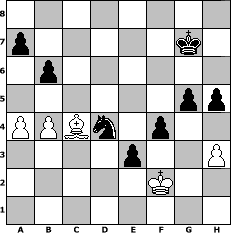 game notation in PGN-format [Event "Ja, is denn heut scho Weihnachten?"] [Site "www.myChess.de"] [Date "2014.12.06"] [Round "1"] [White "freizeitspieler"] [Black "Joschi"] [ECO "A45"] [WhitemyELO "1582"] [BlackmyELO "1604"] [Result "0-1"] [TimeControl "10/2592000"] [WhiteDays "136"] [BlackDays "150"] [MyChessNo "97075"] 1. d4 Nf6 2. Nc3 d5 3. e4 dxe4 4. f3 exf3 5. Nxf3 Bg4 6. Be3 e6 7. Bc4 Be7 8. O-O O-O 9. Qe1 Nbd7 10. Qg3 Bxf3 11. Rxf3 c5 12. Raf1 cxd4 13. Bxd4 Kh8 14. Bd3 Bc5 15. Qh4 Bxd4+ 16. Qxd4 Qb6 17. Qxb6 Nxb6 18. Rh3 Nbd7 19. b3 Rac8 20. Ne4 b6 21. g4 Nxe4 22. Bxe4 g6 23. g5 Kg7 24. Rhf3 f5 25. Bd3 e5 26. Bc4 e4 27. Rh3 Ne5 28. Bd5 Rxc2 29. a4 Nf7 30. Re3 Nxg5 31. Rf2 Rxf2 32. Kxf2 Rd8 33. Bc4 Rd2+ 34. Kg3 Nf3 35. Re2 Rxe2 36. Bxe2 Nd4 37. Bc4 g5 38. h3 h5 39. b4 f4+ 40. Kf2 e3+ 0-1 position notation in FEN-format 8/p5k1/1p6/6pp/PPBn1p2/4p2P/5K2/8 - - - 0 41 Captured white pieces: ![]() ![]() ![]() ![]() ![]() ![]() ![]() ![]() ![]() ![]() ![]() ![]() ![]() ![]() ![]() Captured black pieces: ![]() ![]() ![]() ![]() ![]() ![]() ![]() ![]() ![]() ![]() ![]() ![]() ![]() ![]() ![]() Click on a captured piece in order to display the desired move!