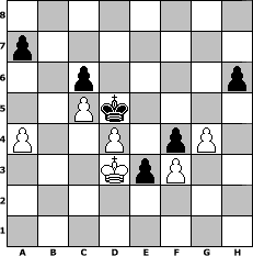 game notation in PGN-format [Event "Freibier f"] [Site "www.myChess.de"] [Date "2006.11.11"] [Round "1"] [White "Seneca"] [Black "Robur"] [ECO "D01"] [WhitemyELO "1711"] [BlackmyELO "1842"] [Result "0-1"] [TimeControl "10/864000"] [WhiteDays "24"] [BlackDays "03"] [MyChessNo "30001"] 1. d4 d5 2. Nc3 e6 3. e4 Be7 4. exd5 exd5 5. Nf3 Bg4 6. Bf4 Nf6 7. Be2 O-O 8. O-O Re8 9. h3 Bxf3 10. Bxf3 c6 11. Re1 Nbd7 12. a3 Nf8 13. Bg5 Bd6 14. Rxe8 Qxe8 15. Bxf6 gxf6 16. Qd2 Ng6 17. Re1 Qd7 18. Bg4 f5 19. Bf3 Re8 20. Rxe8+ Qxe8 21. b4 Qe7 22. Ne2 Nh4 23. Qd3 Nxf3+ 24. Qxf3 Qe4 25. Qe3 f4 26. Qxe4 dxe4 27. c4 Kg7 28. Nc3 f5 29. Kf1 b6 30. c5 bxc5 31. bxc5 Bc7 32. f3 e3 33. Ke2 Kf7 34. a4 Ba5 35. Kd3 Bxc3 36. Kxc3 Ke6 37. Kd3 Kd5 38. g4 fxg4 39. hxg4 h6 0-1 position notation in FEN-format 8/p7/2p4p/2Pk4/P2P1pP1/3KpP2/8/8 - - - 0 40 Captured white pieces: Captured black pieces: Click on a captured piece in order to display the desired move!