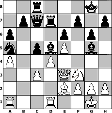 game notation in PGN-format [Event "3. Weihnachts-Open des Club Helvetia"] [Site "www.myChess.de"] [Date "2006.12.01"] [Round "1"] [White "bjeu"] [Black "BirdofPray1"] [ECO "A06"] [WhitemyELO "2190"] [BlackmyELO "2135"] [Result "0-1"] [TimeControl "10/1728000"] [WhiteDays "00"] [BlackDays "11"] [MyChessNo "30600"] 1. Nf3 d5 2. d4 Nf6 3. c4 e6 4. Nc3 Nc6 5. a3 Ne4 6. e3 Nxc3 7. bxc3 Bd6 8. Bd3 dxc4 9. Bxc4 O-O 10. O-O Na5 11. Bd3 c5 12. e4 Bd7 13. e5 Be7 14. Qc2 g6 15. Be2 Qc7 16. Bh6 Rfd8 17. Qd3 a6 18. a4 Rac8 19. Rfb1 Bc6 20. Qe3 Bd5 21. Rd1 Rd7 22. Bg5 Bxg5 0-1 position notation in FEN-format 2r3k1/1pqr1p1p/p3p1p1/n1pbP1b1/P2P4/2P1QN2/4BPPP/R2R2K1 - - - 0 23 Captured white pieces: ![]() ![]() ![]() ![]() ![]() ![]() ![]() ![]() ![]() ![]() ![]() ![]() ![]() ![]() ![]() Captured black pieces: ![]() ![]() ![]() ![]() ![]() ![]() ![]() ![]() ![]() ![]() ![]() ![]() ![]() ![]() ![]() Click on a captured piece in order to display the desired move!