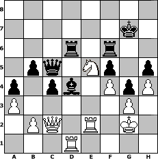 game notation in PGN-format [Event "Unser WM-Turnier"] [Site "www.myChess.de"] [Date "2018.07.07"] [Round "1"] [White "HenrySchinasky"] [Black "tiano"] [ECO "D37"] [WhitemyELO "2146"] [BlackmyELO "1561"] [Result "1-0"] [TimeControl "10/3456000"] [WhiteDays "38"] [BlackDays "38"] [MyChessNo "112564"] 1. d4 d5 2. c4 e6 3. Nc3 Nf6 4. Nf3 Be7 5. Bf4 O-O 6. e3 b6 7. cxd5 Nxd5 8. Nxd5 Qxd5 9. a3 c5 10. Be2 Ba6 11. O-O Rc8 12. h3 Bxe2 13. Qxe2 Nd7 14. Rfd1 Qb7 15. Rd2 c4 16. Rc2 b5 17. Rd1 Rd8 18. Rdc1 a6 19. Nd2 Rac8 20. Bg3 Nb8 21. Qg4 Nc6 22. Nf3 f5 23. Qh5 g6 24. Qh6 Bf8 25. Qh4 Qg7 26. Be5 Nxe5 27. Nxe5 Bd6 28. f4 Qb7 29. Nf3 Be7 30. Qe1 Qe4 31. Kf2 h6 32. Qa5 Qb7 33. Kg1 Kh7 34. Qc3 Qe4 35. Rf2 Rg8 36. Re1 Rg7 37. h4 Bf6 38. Qa5 Qb7 39. Qc3 Rgc7 40. Rfe2 Rd8 41. Rc1 Qb6 42. Kh2 a5 43. Qe1 Rc6 44. Qg1 Rc7 45. Qe1 a4 46. e4 Rg7 47. exf5 exf5 48. Rd1 Qc7 49. Qg3 Qd6 50. Ne5 Qd5 51. Kg1 Re8 52. Kh2 Bd8 53. Qf2 Re6 54. Qg3 g5 55. Qh3 g4 56. Qg3 h5 57. Qc3 Bb6 58. Qc2 Rf6 59. Rde1 Ra7 60. Rd1 Ra8 61. Qc3 Rd8 62. Qc2 Rdd6 63. g3 Kg7 64. Red2 Rd8 65. Rg2 Bxd4 66. Re2 Qc5 67. Red2 Rd5 68. Kg2 Rdd6 69. Re2 1-0 position notation in FEN-format 8/6k1/3r1r2/1pq1Np1p/p1pb1PpP/P5P1/1PQ1R1K1/3R4 - - - 7 69 Captured white pieces: Captured black pieces: Click on a captured piece in order to display the desired move!
