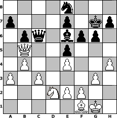 game notation in PGN-format [Event "Die Weinlese"] [Site "www.myChess.de"] [Date "2016.09.01"] [Round "1"] [White "muetoe"] [Black "Lohl"] [ECO "B53"] [WhitemyELO "1965"] [BlackmyELO "1739"] [Result "1-0"] [TimeControl "10/1728000"] [WhiteDays "66"] [BlackDays "00"] [MyChessNo "104693"] 1. e4 c5 2. Nf3 d6 3. d4 cxd4 4. Qxd4 Bd7 5. h3 Nc6 6. Qe3 g6 7. Bd2 Bh6 8. Qb3 Bxd2+ 9. Nbxd2 Nf6 10. a3 O-O 11. Qe3 Qc7 12. Bd3 Ne5 13. Nxe5 dxe5 14. O-O Nh5 15. Nf3 Rfd8 16. Rad1 Nf4 17. Rd2 f6 18. Rfd1 Be6 19. Bf1 Rxd2 20. Rxd2 Rd8 21. c3 b6 22. h4 Rxd2 23. Nxd2 Bd7 24. Nf3 Kg7 25. b3 Ne6 26. b4 Qc6 27. g3 Nc7 28. Nd2 Be6 29. Qd3 Ne8 30. Qb5 1-0 position notation in FEN-format 4n3/p3p1kp/1pq1bpp1/1Q2p3/1P2P2P/P1P3P1/3NPP2/5BK1 - - - 6 30 Captured white pieces: Captured black pieces: Click on a captured piece in order to display the desired move!