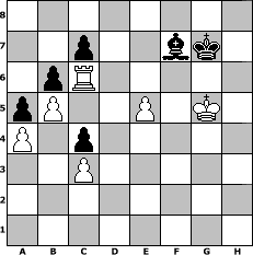 game notation in PGN-format [Event "In Memorium Michael Knopf"] [Site "www.myChess.de"] [Date "2012.04.10"] [Round "1"] [White "augustus"] [Black "Master1"] [ECO "C23"] [WhitemyELO "1299"] [BlackmyELO "1355"] [Result "1-0"] [TimeControl "10/2592000"] [WhiteDays "131"] [BlackDays "130"] [MyChessNo "81086"] 1. e4 e5 2. Bc4 Nc6 3. Nf3 Nf6 4. d3 Bc5 5. Bg5 O-O 6. O-O h6 7. Be3 Bxe3 8. fxe3 d6 9. Qe2 Na5 10. a3 Nxc4 11. dxc4 b6 12. b4 Nxe4 13. a4 a6 14. Nbd2 Nxd2 15. Nxd2 f5 16. h3 e4 17. Qh5 Be6 18. Qg6 Rf6 19. Qh5 Qd7 20. Rf4 Bf7 21. Qh4 Qe6 22. Kh2 Qe5 23. Raf1 g5 24. Qg3 Rg6 25. Rxf5 Qxg3+ 26. Kxg3 Be6 27. R5f2 d5 28. Kh2 dxc4 29. Nxe4 a5 30. b5 Bd5 31. Nf6+ Rxf6 32. Rxf6 Kg7 33. c3 Re8 34. R6f5 Be6 35. Re5 Bd7 36. Rxe8 Bxe8 37. g4 Kg6 38. e4 Bf7 39. e5 Kg7 40. Rd1 Be6 41. Kg3 Kg6 42. Rf1 Kg7 43. h4 gxh4+ 44. Kxh4 Kg8 45. g5 hxg5+ 46. Kxg5 Kg7 47. Rf6 Bf7 48. Rc6 1-0 position notation in FEN-format 8/2p2bk1/1pR5/pP2P1K1/P1p5/2P5/8/8 - - - 4 48 Captured white pieces: Captured black pieces: Click on a captured piece in order to display the desired move!