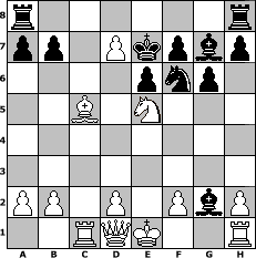 game notation in PGN-format [Event "BENONI"] [Site "www.myChess.de"] [Date "2005.06.20"] [Round "1"] [White "TAR"] [Black "Gno"] [ECO "A56"] [WhitemyELO "1351"] [BlackmyELO "1141"] [Result "1-0"] [TimeControl "10/864000"] [WhiteDays "10"] [BlackDays "10"] [MyChessNo "14196"] 1. d4 Nf6 2. c4 c5 3. dxc5 Qa5+ 4. Nc3 Qxc5 5. e4 d6 6. Nf3 e6 7. Be3 Qc7 8. Nb5 Qe7 9. e5 dxe5 10. c5 Nc6 11. Nd6+ Qxd6 12. cxd6 Bd7 13. Rc1 g6 14. Bb5 Bg7 15. Bxc6 Bxc6 16. Nxe5 Bxg2 17. d7+ Ke7 18. Bc5+ 1-0 position notation in FEN-format r6r/pp1Pkpbp/4pnp1/2B1N3/8/8/PP1P1PbP/2RQK2R - K - 2 18 Captured white pieces: ![]() ![]() ![]() ![]() ![]() ![]() ![]() ![]() ![]() ![]() ![]() ![]() ![]() ![]() ![]() Captured black pieces: ![]() ![]() ![]() ![]() ![]() ![]() ![]() ![]() ![]() ![]() ![]() ![]() ![]() ![]() ![]() Click on a captured piece in order to display the desired move!