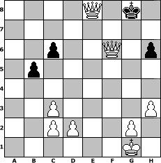 game notation in PGN-format [Event "°°°]^^[-Wilkommen im Jahr 2009-]^^[°°°"] [Site "www.myChess.de"] [Date "2009.01.03"] [Round "1"] [White "frankto"] [Black "sel"] [ECO "D00"] [WhitemyELO "1514"] [BlackmyELO "1495"] [Result "1-0"] [TimeControl "10/864000"] [WhiteDays "40"] [BlackDays "40"] [MyChessNo "51321"] 1. d4 d5 2. e4 dxe4 3. Nc3 Nf6 4. f3 exf3 5. Nxf3 Bg4 6. h3 Bxf3 7. Qxf3 c6 8. Be3 e6 9. Bd3 Bb4 10. a3 Bxc3+ 11. bxc3 h6 12. O-O Qd5 13. Qg3 Kf8 14. Rab1 b5 15. a4 a6 16. axb5 axb5 17. Ra1 Rxa1 18. Qxb8+ Ne8 19. Rxa1 e5 20. Ra8 Qe6 21. Bf5 Qe7 22. d5 g6 23. d6 Kg7 24. dxe7 gxf5 25. Qxe5+ Kh7 26. Qxf5+ Kg7 27. Bd4+ f6 28. Bxf6+ Nxf6 29. Rxh8 Kxh8 30. Qxf6+ Kg8 31. e8=Q+ 1-0 position notation in FEN-format 4Q1k1/8/2p2Q1p/1p6/8/2P4P/2PP2P1/6K1 - - - 0 31 Captured white pieces: Captured black pieces: Click on a captured piece in order to display the desired move!