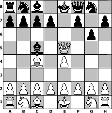 game notation in PGN-format [Event "Eine Chance f"] [Site "www.myChess.de"] [Date "2008.08.01"] [Round "1"] [White "Helmut48"] [Black "Steppenwolf"] [ECO "C23"] [WhitemyELO "1409"] [BlackmyELO "1173"] [Result "1-0"] [TimeControl "10/1728000"] [WhiteDays "20"] [BlackDays "10"] [MyChessNo "46753"] 1. e4 e5 2. Bc4 Bc5 3. Qh5 g6 4. Qxe5+ Qe7 5. Qxh8 Qf8 6. Qe5+ 1-0 position notation in FEN-format rnb1kqn1/pppp1p1p/6p1/2b1Q3/2B1P3/8/PPPPPPPP/RNB1K1NR - KQq - 2 6 Captured white pieces: ![]() ![]() ![]() ![]() ![]() ![]() ![]() ![]() ![]() ![]() ![]() ![]() ![]() ![]() ![]() Captured black pieces: ![]() ![]() ![]() ![]() ![]() ![]() ![]() ![]() ![]() ![]() ![]() ![]() ![]() ![]() ![]() Click on a captured piece in order to display the desired move!