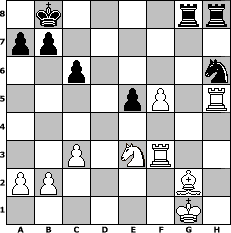 game notation in PGN-format [Event "READY TO RUMBLE!!!"] [Site "www.myChess.de"] [Date "2004.01.27"] [Round "1"] [White "UPS"] [Black "Vouivre"] [ECO "C40"] [WhitemyELO "1483"] [BlackmyELO "1459"] [Result "1-0"] [TimeControl "10/3456000"] [WhiteDays "159"] [BlackDays "152"] [MyChessNo "2033"] 1. e4 e5 2. Nf3 f5 3. d3 d6 4. Nc3 Nf6 5. Be2 Nc6 6. O-O f4 7. h3 Be6 8. Ng5 Qd7 9. Nxe6 Qxe6 10. Bg4 Qe7 11. g3 g6 12. gxf4 h5 13. Bf3 O-O-O 14. fxe5 Nxe5 15. Bg5 Qe6 16. Bg2 Be7 17. d4 Ng8 18. Bxe7 Qxe7 19. dxe5 dxe5 20. Qe2 g5 21. Nd5 Qe6 22. f3 Kb8 23. Rad1 Nh6 24. Rd3 g4 25. f4 gxh3 26. Rxh3 Rdg8 27. f5 Qd6 28. Rxh5 c6 29. Ne3 Qd4 30. c3 Qxe4 31. Qf3 Qxf3 32. Rxf3 1-0 position notation in FEN-format 1k4rr/pp6/2p4n/4pP1R/8/2P1NR2/PP4B1/6K1 - - - 0 32 Captured white pieces: ![]() ![]() ![]() ![]() ![]() ![]() ![]() ![]() ![]() ![]() ![]() ![]() ![]() ![]() ![]() Captured black pieces: ![]() ![]() ![]() ![]() ![]() ![]() ![]() ![]() ![]() ![]() ![]() ![]() ![]() ![]() ![]() Click on a captured piece in order to display the desired move!