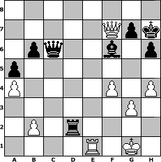 game notation in PGN-format [Event "unter uns Nr. 30 (Weihnachtsturnier)"] [Site "www.myChess.de"] [Date "2015.12.21"] [Round "2"] [White "Haneken"] [Black "Caligula"] [ECO "C44"] [WhitemyELO "1087"] [BlackmyELO "1314"] [Result "0-1"] [TimeControl "10/2592000"] [WhiteDays "116"] [BlackDays "100"] [MyChessNo "101779"] 1. e4 e5 2. Nf3 Nc6 3. d3 Nf6 4. Bg5 Be7 5. Be2 d6 6. O-O h6 7. Be3 a5 8. a4 b6 9. Nc3 Be6 10. Nb5 O-O 11. h4 d5 12. g3 d4 13. Bd2 Qd7 14. c3 dxc3 15. Bxc3 Bg4 16. Nxe5 Bxe2 17. Qxe2 Nxe5 18. Bxe5 c6 19. Bxf6 Bxf6 20. Na3 Rab8 21. e5 Rfe8 22. Nc4 Qh3 23. Nd6 Rxe5 24. Qf3 Rd8 25. Qxc6 Qe6 26. d4 Rd5 27. Rfe1 Qxd6 28. Re8+ Rxe8 29. Qxe8+ Kh7 30. Qxf7 Rxd4 31. f4 Rd2 32. Re1 Qc6 0-1 position notation in FEN-format 8/5Qpk/1pq2b1p/p7/P4P1P/6P1/1P1r4/4R1K1 - - - 3 33 Captured white pieces: Captured black pieces: Click on a captured piece in order to display the desired move!