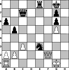 game notation in PGN-format [Event "Schach on the beach"] [Site "www.myChess.de"] [Date "2015.05.21"] [Round "1"] [White "martinus"] [Black "Cuibono"] [ECO "D03"] [WhitemyELO "1784"] [BlackmyELO "2019"] [Result "0-1"] [TimeControl "10/2592000"] [WhiteDays "148"] [BlackDays "129"] [MyChessNo "99317"] 1. d4 d5 2. Nf3 Nf6 3. Bg5 Bf5 4. e3 e6 5. Bd3 Bg6 6. O-O Nbd7 7. Nc3 Be7 8. Bf4 c5 9. dxc5 Nxc5 10. Bb5+ Ncd7 11. e4 dxe4 12. Ne5 a6 13. Ba4 Qc8 14. Bxd7+ Nxd7 15. Nxg6 hxg6 16. Nxe4 Qc6 17. Re1 Rd8 18. Qe2 Nb6 19. Rad1 O-O 20. h3 Nd5 21. Be5 b5 22. c3 f6 23. Bg3 e5 24. Nd2 Bc5 25. Ne4 Bb6 26. Kh1 f5 27. Ng5 e4 28. Be5 Rde8 29. Bd4 Bd8 30. h4 Bxg5 31. hxg5 Nf4 32. Qe3 Nd3 33. Re2 f4 34. Qh3 f3 35. Red2 Nf4 36. Qg3 Nxg2 37. Be5 Qe6 38. Bc7 e3 39. fxe3 Nxe3 40. Ra1 f2 41. Rxf2 Rxf2 42. Qxf2 Qc6+ 43. Kg1 Qxc7 0-1 position notation in FEN-format 4r1k1/2q3p1/p5p1/1p4P1/8/2P1n3/PP3Q2/R5K1 - - - 0 44 Captured white pieces: Captured black pieces: Click on a captured piece in order to display the desired move!