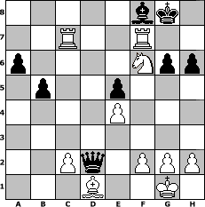 game notation in PGN-format [Event "Wrixum - Open die III."] [Site "www.myChess.de"] [Date "2006.10.24"] [Round "1"] [White "bane"] [Black "Bauer91"] [ECO "A10"] [WhitemyELO "1733"] [BlackmyELO "1477"] [Result "1-0"] [TimeControl "10/3456000"] [WhiteDays "160"] [BlackDays "159"] [MyChessNo "29458"] 1. c4 d6 2. e4 Nf6 3. Nc3 c6 4. Nf3 Bg4 5. Be2 g6 6. O-O Bg7 7. d4 Bxf3 8. Bxf3 Nbd7 9. Bg5 O-O 10. b4 a6 11. a3 Rb8 12. a4 Qc7 13. a5 e6 14. Qd3 Rfe8 15. Qe3 e5 16. d5 cxd5 17. cxd5 h6 18. Bxf6 Nxf6 19. Rac1 Qc4 20. Qb6 Red8 21. Nb1 Qb3 22. Nd2 Qa4 23. Be2 Nd7 24. Qxd6 Bf8 25. Qc7 Qxb4 26. Rfd1 Rbc8 27. Qxc8 Rxc8 28. Rxc8 Qxa5 29. d6 Kg7 30. Rc7 Qa4 31. Nc4 b5 32. Ne3 Nf6 33. d7 Nxd7 34. Rdxd7 Qa1+ 35. Bd1 Qa2 36. Nd5 Kg8 37. Rxf7 Qd2 38. Nf6+ 1-0 position notation in FEN-format 5bk1/2R2R2/p4Npp/1p2p3/4P3/8/2Pq1PPP/3B2K1 - - - 2 38 Captured white pieces: Captured black pieces: Click on a captured piece in order to display the desired move!