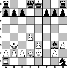 game notation in PGN-format [Event "Mal wieder spielen ?"] [Site "www.myChess.de"] [Date "2012.04.09"] [Round "1"] [White "borsti"] [Black "nogumo"] [ECO "A02"] [WhitemyELO "1200"] [BlackmyELO "1623"] [Result "0-1"] [TimeControl "10/2592000"] [WhiteDays "60"] [BlackDays "52"] [MyChessNo "81039"] 1. f4 e5 2. fxe5 d6 3. exd6 Bxd6 4. Nf3 Bg4 5. e3 Nd7 6. h3 Bg3+ 7. Ke2 Bh5 8. d4 Ngf6 9. Kd3 Ne5+ 10. Kc3 Ne4+ 11. Kb3 Nf2 12. Qe2 Nxf3 13. Nd2 Nxd2+ 14. Bxd2 Bxe2 15. Bxe2 Nxh1 0-1 position notation in FEN-format r2qk2r/ppp2ppp/8/8/3P4/1K2P1bP/PPPBB1P1/R6n - kq - 0 16 Captured white pieces: ![]() ![]() ![]() ![]() ![]() ![]() ![]() ![]() ![]() ![]() ![]() ![]() ![]() ![]() ![]() Captured black pieces: ![]() ![]() ![]() ![]() ![]() ![]() ![]() ![]() ![]() ![]() ![]() ![]() ![]() ![]() ![]() Click on a captured piece in order to display the desired move!