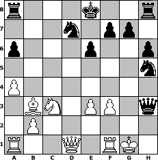game notation in PGN-format [Event "?"] [Site "www.myChess.de"] [Date "2025.11.01"] [Round "?"] [White "skuehnel"] [Black "Leon"] [ECO "B01"] [WhitemyELO "1365"] [BlackmyELO "2091"] [Result "0-1"] [TimeControl "10/2592000"] [WhiteDays "68"] [BlackDays "89"] [MyChessNo "133906"] 1. e4 d5 2. exd5 Qxd5 3. Nc3 Qd8 4. d4 e6 5. Nf3 Nf6 6. Bc4 Be7 7. O-O a6 8. h3 b5 9. Bb3 Bb7 10. Ng5 h6 11. Nf3 c5 12. dxc5 Qc7 13. Be3 Nbd7 14. a4 b4 15. Ne2 Bxf3 16. gxf3 Bxc5 17. c3 bxc3 18. Nxc3 Bxe3 19. fxe3 Qg3+ 20. Kh1 Qxh3+ 21. Kg1 Qg3+ 22. Kh1 Qh3+ 23. Kg1 Nh5 0-1 position notation in FEN-format r3k2r/3n1pp1/p3p2p/7n/P7/1BN1PP1q/1P6/R2Q1RK1 - kq - 6 24 Captured white pieces: Captured black pieces: Click on a captured piece in order to display the desired move!