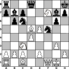 game notation in PGN-format [Event "besser werden durch "] [Site "www.myChess.de"] [Date "2007.06.11"] [Round "1"] [White "TAR"] [Black "Knight"] [ECO "B00"] [WhitemyELO "1179"] [BlackmyELO "1268"] [Result "1-0"] [TimeControl "10/864000"] [WhiteDays "18"] [BlackDays "20"] [MyChessNo "35630"] 1. e4 b6 2. d3 Bb7 3. g3 g6 4. Bg2 Bg7 5. f4 e5 6. Nf3 Ne7 7. fxe5 O-O 8. O-O Nbc6 9. d4 f5 10. exf6 Bxf6 11. Nc3 d5 12. e5 Bg7 13. Ng5 Rxf1+ 14. Qxf1 Nf5 15. Bxd5+ Kh8 16. Nf7+ 1-0 position notation in FEN-format r2q3k/pbp2Nbp/1pn3p1/3BPn2/3P4/2N3P1/PPP1P2P/R1B2QK1 - - - 2 16 Captured white pieces: ![]() ![]() ![]() ![]() ![]() ![]() ![]() ![]() ![]() ![]() ![]() ![]() ![]() ![]() ![]() Captured black pieces: ![]() ![]() ![]() ![]() ![]() ![]() ![]() ![]() ![]() ![]() ![]() ![]() ![]() ![]() ![]() Click on a captured piece in order to display the desired move!