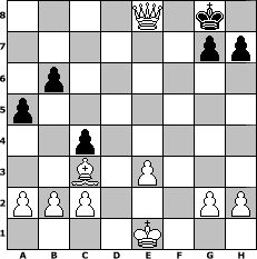 game notation in PGN-format [Event "> 1500"] [Site "www.myChess.de"] [Date "2010.03.18"] [Round "1"] [White "Caligula"] [Black "alpacino"] [ECO "D02"] [WhitemyELO "1318"] [BlackmyELO "1290"] [Result "1-0"] [TimeControl "10/2592000"] [WhiteDays "120"] [BlackDays "106"] [MyChessNo "64091"] 1. d4 d5 2. Nf3 Nc6 3. Nc3 e6 4. e3 Bb4 5. Bd2 Bxc3 6. Bxc3 Nf6 7. Bd3 Ne4 8. Bxe4 dxe4 9. Nd2 f5 10. f3 O-O 11. fxe4 fxe4 12. Qg4 e5 13. Qxe4 Qf6 14. Rf1 Qxf1+ 15. Nxf1 Bf5 16. Qd5+ Kh8 17. O-O-O a6 18. dxe5 Rad8 19. Qb3 Rxd1+ 20. Kxd1 Bg4+ 21. Ke1 b6 22. Qc4 Nb8 23. Qxg4 Nc6 24. e6 Rg8 25. Qe4 Ne7 26. Ng3 c6 27. Nf5 Nxf5 28. Qxf5 a5 29. e7 c5 30. Qf7 c4 31. Qxg8+ Kxg8 32. e8=Q# 1-0 position notation in FEN-format 4Q1k1/6pp/1p6/p7/2p5/2B1P3/PPP3PP/4K3 - - - 0 32 Captured white pieces: Captured black pieces: Click on a captured piece in order to display the desired move!