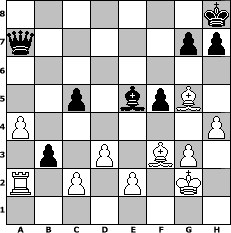 game notation in PGN-format [Event "9er4"] [Site "www.myChess.de"] [Date "2014.01.18"] [Round "1"] [White "Duschgel"] [Black "sprinterde"] [ECO "A20"] [WhitemyELO "1666"] [BlackmyELO "1681"] [Result "0-1"] [TimeControl "10/3456000"] [WhiteDays "38"] [BlackDays "40"] [MyChessNo "92391"] 1. c4 e5 2. g3 d5 3. cxd5 Qxd5 4. Nf3 Nc6 5. Nc3 Qe6 6. Bg2 Bb4 7. O-O Nge7 8. Nb5 Ba5 9. Ng5 Qf6 10. d3 a6 11. Ne4 Qg6 12. Nbc3 O-O 13. a3 Rd8 14. f4 Kh8 15. fxe5 Nxe5 16. Nc5 Ng4 17. Kh1 Bb6 18. Nxb7 Bxb7 19. Bxb7 Ra7 20. Be4 Qh5 21. h4 Nf2+ 22. Rxf2 Bxf2 23. Kg2 Bd4 24. Bd2 f5 25. Bf3 Qg6 26. Bg5 Qe6 27. Qa4 c5 28. Nb5 Qd7 29. Bxe7 axb5 30. Qxa7 Qxa7 31. Bxd8 Bxb2 32. Ra2 Be5 33. Bg5 b4 34. a4 b3 0-1 position notation in FEN-format 7k/q5pp/8/2p1bpB1/P6P/1p1P1BP1/R1P1P1K1/8 - - - 0 35 Captured white pieces: Captured black pieces: Click on a captured piece in order to display the desired move!