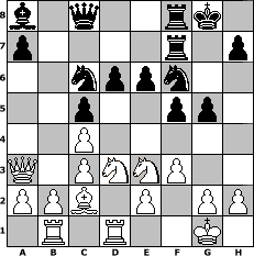 game notation in PGN-format [Event "1.MySchach-960-Cup 2015"] [Site "www.myChess.de"] [Date "2015.10.07"] [Round "1"] [White "Peterlie77 (C)"] [Black "nyffhans"] [Variant "Fischerrandom"] [SetUp "1"] [FEN "bbqnnrkr/pppppppp/8/8/8/8/PPPPPPPP/BBQNNRKR w KQkq - 0 1"] [WhitemyELO "2084"] [BlackmyELO "1996"] [Result "1-0"] [TimeControl "10/1728000"] [WhiteDays "20"] [BlackDays "00"] [MyChessNo "100683"] 1. b4 b6 2. c4 c5 3. Ne3 e6 4. bxc5 bxc5 5. Nd3 d6 6. f3 f5 7. Qa3 Rf7 8. Bc2 Nc6 9. Rb1 O-O 10. O-O Bc7 11. Nf4 Ba5 12. Bc3 Bxc3 13. dxc3 g5 14. Nd3 Nf6 15. Rfd1 1-0 position notation in FEN-format b1q2rk1/p4r1p/2nppn2/2p2pp1/2P5/Q1PNNP2/PPB1P1PP/1R1R2K1 - - - 3 15 Captured white pieces: Captured black pieces: Click on a captured piece in order to display the desired move!