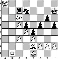 game notation in PGN-format [Event "2013 zum Ersten"] [Site "www.myChess.de"] [Date "2013.01.01"] [Round "1"] [White "espero"] [Black "Master1"] [ECO "D00"] [WhitemyELO "1754"] [BlackmyELO "1340"] [Result "1-0"] [TimeControl "10/2592000"] [WhiteDays "111"] [BlackDays "103"] [MyChessNo "85760"] 1. d4 d5 2. Bf4 Bf5 3. c4 c6 4. e3 Nf6 5. Nc3 e6 6. Qb3 Bd6 7. Bxd6 Qxd6 8. Qxb7 O-O 9. Qxa8 Ne4 10. Qxa7 Nxc3 11. bxc3 h6 12. c5 Qd7 13. Qb6 Re8 14. Nf3 Qc8 15. Be2 Nd7 16. Qa6 Qxa6 17. Bxa6 Nb8 18. Be2 Nd7 19. Kd2 Rb8 20. Rhc1 Rb2+ 21. Ke1 f6 22. a4 e5 23. a5 Rb7 24. a6 Ra7 25. Rcb1 Bxb1 26. Rxb1 e4 27. Nh4 Kh7 28. Nf5 g6 29. Ne7 f5 30. Nxc6 Rc7 31. a7 h5 32. a8=Q 1-0 position notation in FEN-format Q7/2rn3k/2N3p1/2Pp1p1p/3Pp3/2P1P3/4BPPP/1R2K3 - - - 0 32 Captured white pieces: Captured black pieces: Click on a captured piece in order to display the desired move!