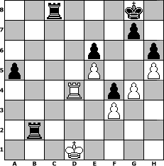 game notation in PGN-format [Event "QGD: Orthodox Verteidigung"] [Site "www.myChess.de"] [Date "2008.08.11"] [Round "1"] [White "andreas007"] [Black "ujack1961"] [ECO "D64"] [WhitemyELO "1391"] [BlackmyELO "1683"] [Result "0-1"] [TimeControl "10/2592000"] [WhiteDays "149"] [BlackDays "150"] [MyChessNo "47039"] 1. d4 d5 2. c4 e6 3. Nc3 Nf6 4. Bg5 Be7 5. e3 O-O 6. Nf3 Nbd7 7. Rc1 c6 8. Qc2 a6 9. Bd3 dxc4 10. Bxc4 b5 11. Bd3 h6 12. Bh4 Bb7 13. O-O Rc8 14. a4 b4 15. Ne4 Nb6 16. b3 Nfd5 17. Bxe7 Qxe7 18. Nc5 a5 19. Nxb7 Qxb7 20. h4 f5 21. Nh2 f4 22. e4 Nf6 23. e5 Nfd5 24. Bh7+ Kh8 25. Bg6 Nc3 26. g4 c5 27. f3 cxd4 28. Be4 Qd7 29. h5 Rc7 30. Qg2 d3 31. Rcd1 Nxd1 32. Rxd1 Rc3 33. Qf2 Rb8 34. Qb2 Qd4+ 35. Qf2 Qxf2+ 36. Kxf2 Rd8 37. Nf1 Rxb3 38. Nd2 Rb2 39. Ke1 Ra2 40. Bc6 Nxa4 41. Bxa4 Rxa4 42. Nc4 Ra2 43. Nd6 Kg8 44. Rxd3 Rb8 45. Rd4 b3 46. Nc4 Rc8 47. Kd1 b2 48. Nxb2 Rxb2 0-1 position notation in FEN-format 2r3k1/6p1/4p2p/p3P2P/3R1pP1/5P2/1r6/3K4 - - - 0 49 Captured white pieces: ![]() ![]() ![]() ![]() ![]() ![]() ![]() ![]() ![]() ![]() ![]() ![]() ![]() ![]() ![]() Captured black pieces: ![]() ![]() ![]() ![]() ![]() ![]() ![]() ![]() ![]() ![]() ![]() ![]() ![]() ![]() ![]() Click on a captured piece in order to display the desired move!