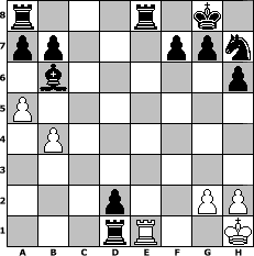 game notation in PGN-format [Event "Gegen die Herbstdepression"] [Site "www.myChess.de"] [Date "2008.12.01"] [Round "1"] [White "babikar"] [Black "neve"] [ECO "B50"] [WhitemyELO "1376"] [BlackmyELO "1447"] [Result "0-1"] [TimeControl "10/864000"] [WhiteDays "10"] [BlackDays "10"] [MyChessNo "50355"] 1. e4 c5 2. Nf3 d6 3. c4 Nf6 4. Nc3 e5 5. Nd5 Nxe4 6. Bd3 Nf6 7. O-O Nbd7 8. Bf5 Nxd5 9. Qa4 N5b6 10. Qc2 Nf6 11. Ng5 h6 12. Nh7 Bxf5 13. Qxf5 Nxh7 14. f4 Qf6 15. fxe5 dxe5 16. d4 cxd4 17. Qe4 Qe7 18. Qg4 Nxc4 19. b3 Nb6 20. Bd2 Qd7 21. Qxd7+ Nxd7 22. Rac1 Nc5 23. Rce1 e4 24. Bb4 e3 25. Bxc5 Bxc5 26. Rc1 Bb6 27. Rfe1 O-O 28. a4 Rfe8 29. b4 e2 30. a5 d3+ 31. Kh1 d2 32. Rcd1 exd1=Q 0-1 position notation in FEN-format r3r1k1/pp3ppn/1b5p/P7/1P6/8/3p2PP/3rR2K - - - 0 33 Captured white pieces: ![]() ![]() ![]() ![]() ![]() ![]() ![]() ![]() ![]() ![]() ![]() ![]() ![]() ![]() ![]() Captured black pieces: ![]() ![]() ![]() ![]() ![]() ![]() ![]() ![]() ![]() ![]() ![]() ![]() ![]() ![]() ![]() Click on a captured piece in order to display the desired move!