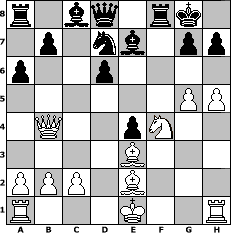 game notation in PGN-format [Event "Winter 2018"] [Site "www.myChess.de"] [Date "2018.01.10"] [Round "1"] [White "Erich"] [Black "atlantis"] [ECO "B90"] [WhitemyELO "2112"] [BlackmyELO "1897"] [Result "1-0"] [TimeControl "10/2592000"] [WhiteDays "59"] [BlackDays "32"] [MyChessNo "110978"] 1. e4 c5 2. Nf3 d6 3. d4 cxd4 4. Nxd4 Nf6 5. Nc3 a6 6. Be3 e6 7. Be2 Qc7 8. f3 Be7 9. Qd2 O-O 10. g4 Nc6 11. g5 Nd7 12. h4 Nxd4 13. Qxd4 f5 14. f4 fxe4 15. h5 e5 16. Qb4 exf4 17. Nd5 Qd8 18. Nxf4 1-0 position notation in FEN-format r1bq1rk1/1p1nb1pp/p2p4/6PP/1Q2pN2/4B3/PPP1B3/R3K2R - KQ - 0 18 Captured white pieces: Captured black pieces: Click on a captured piece in order to display the desired move!