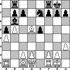 game notation in PGN-format [Event "MYCHESS.DE POTENTIAL FINAL TOURNAMENT"] [Site "www.myChess.de"] [Date "2020.10.03"] [Round "1"] [White "muellerh"] [Black "sprinterde"] [ECO "C47"] [WhitemyELO "1532"] [BlackmyELO "1752"] [Result "1-0"] [TimeControl "10/3456000"] [WhiteDays "20"] [BlackDays "40"] [MyChessNo "119429"] 1. e4 e5 2. Nf3 Nc6 3. Nc3 Nf6 4. Bc4 Bc5 5. O-O O-O 6. a3 d6 7. Nd5 Nxd5 8. Bxd5 Ne7 9. Bc4 Bg4 10. h3 Bh5 11. b4 Bb6 12. a4 a5 13. b5 d5 14. Bd3 Rb8 15. Be2 Bxf3 16. Bxf3 dxe4 17. Bxe4 Qd5 18. Bxd5 1-0 position notation in FEN-format 1r3rk1/1pp1nppp/1b6/pP1Bp3/P7/7P/2PP1PP1/R1BQ1RK1 - - - 0 18 Captured white pieces: Captured black pieces: Click on a captured piece in order to display the desired move!