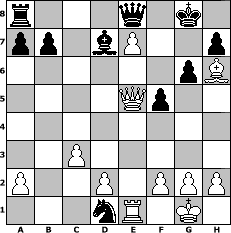 game notation in PGN-format [Event "7er5"] [Site "www.myChess.de"] [Date "2017.05.15"] [Round "1"] [White "espero"] [Black "sprinterde"] [ECO "A40"] [WhitemyELO "1892"] [BlackmyELO "1711"] [Result "1-0"] [TimeControl "10/3456000"] [WhiteDays "40"] [BlackDays "38"] [MyChessNo "108198"] 1. d4 e6 2. e4 Nf6 3. e5 Nd5 4. c4 Ne7 5. Nc3 d6 6. exd6 cxd6 7. Nf3 Nf5 8. Bd3 Nh4 9. O-O Nxf3+ 10. Qxf3 Nc6 11. Be3 Be7 12. Rad1 O-O 13. Rfe1 f5 14. Bb1 Bf6 15. d5 Bxc3 16. bxc3 Ne5 17. Qg3 Nxc4 18. dxe6 Qf6 19. Bg5 Qg6 20. e7 Re8 21. Bd3 Nb2 22. Bb5 Nxd1 23. Bxe8 Qxe8 24. Bh6 g6 25. Qxd6 Bd7 26. Qe5 1-0 position notation in FEN-format r3q1k1/pp1bP2p/6pB/4Qp2/8/2P5/P2P1PPP/3nR1K1 - - - 2 26 Captured white pieces: Captured black pieces: Click on a captured piece in order to display the desired move!
