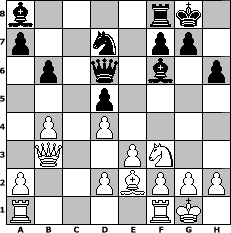game notation in PGN-format [Event "1.Schaltjahresturnier@mySchach"] [Site "www.myChess.de"] [Date "2004.02.29"] [Round "1"] [White "Phantasos"] [Black "Wormatia08"] [ECO "D37"] [WhitemyELO "1695"] [BlackmyELO "1595"] [Result "1-0"] [TimeControl "10/1728000"] [WhiteDays "39"] [BlackDays "40"] [MyChessNo "2569"] 1. d4 d5 2. c4 e6 3. Nc3 Nf6 4. Nf3 Be7 5. Bg5 O-O 6. e3 h6 7. Bh4 b6 8. Be2 Bb7 9. Bxf6 Bxf6 10. cxd5 exd5 11. b4 Qd6 12. Qb3 Nd7 13. Nb5 Qe7 14. Nxc7 Qd6 15. Nxa8 Bxa8 16. O-O 1-0 position notation in FEN-format b4rk1/p2n1pp1/1p1q1b1p/3p4/1P1P4/1Q2PN2/P2PBPPP/R4RK1 - - - 1 16 Captured white pieces: Captured black pieces: Click on a captured piece in order to display the desired move!